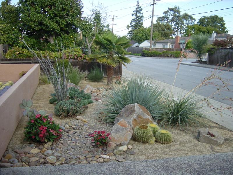 Same desert style landscape. Owners wanted the landscape to match the style of their Spanish Revival house as well as being low maintenance and low water usage. The irrigation for this yard only comes on about once a month for 15 minutes or so.
